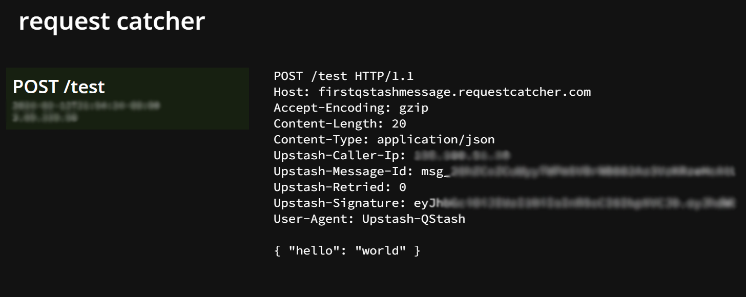 Make sure you have a publicly available HTTP API that you want to send your messages to. If you don’t, you can use something like requestcatcher.com, webhook.site or webhook-test.com to try it out. For example, you can use this URL to test your messages: https://firstqstashmessage.requestcatcher.com